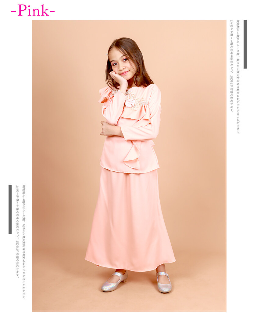 - Moss Crepe- Round Neckline- Elastic Waist- A line cutting- Round Neckline- Long Sleeves- Flower Lace Detail