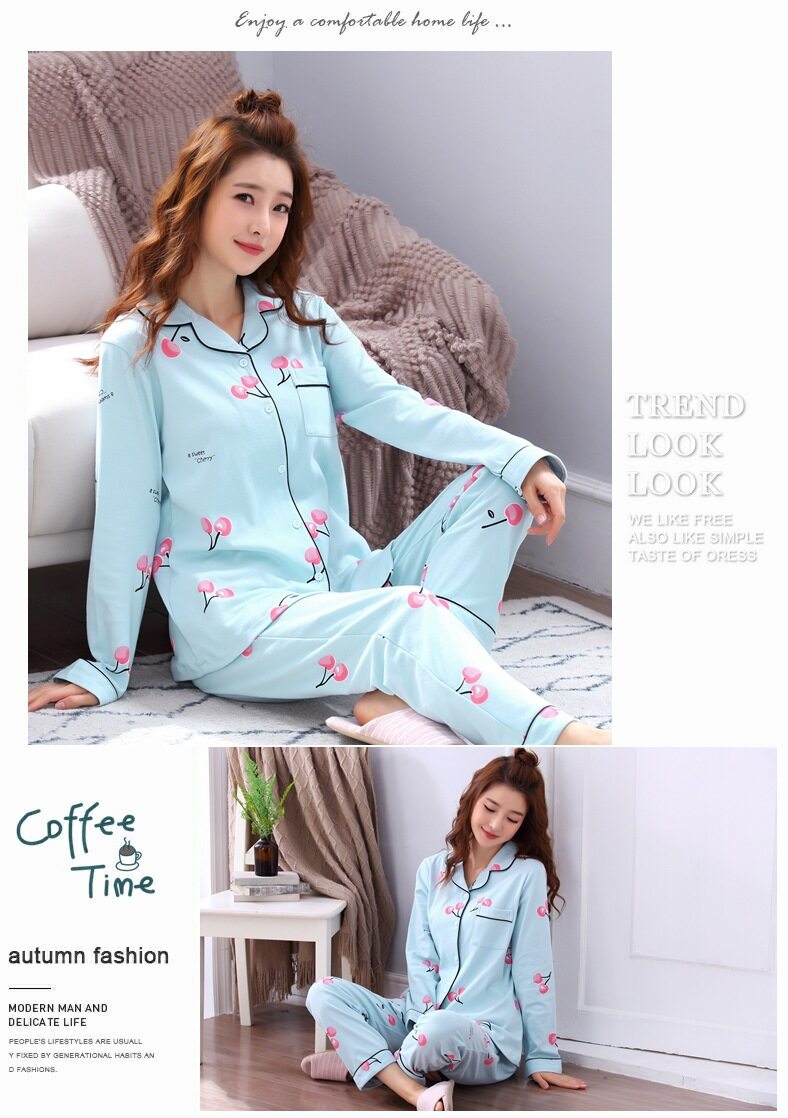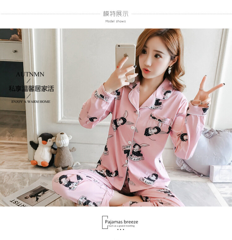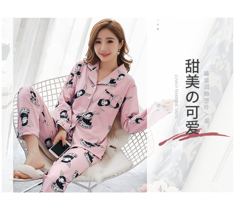 Women Autumn Long Sleeve Ice Silk Set Pyjamas Sleepwear Print Nightwear Baju Tidur Wanita B [PJ22156]