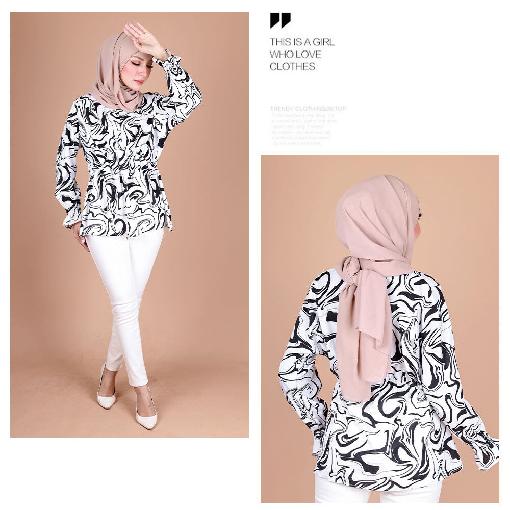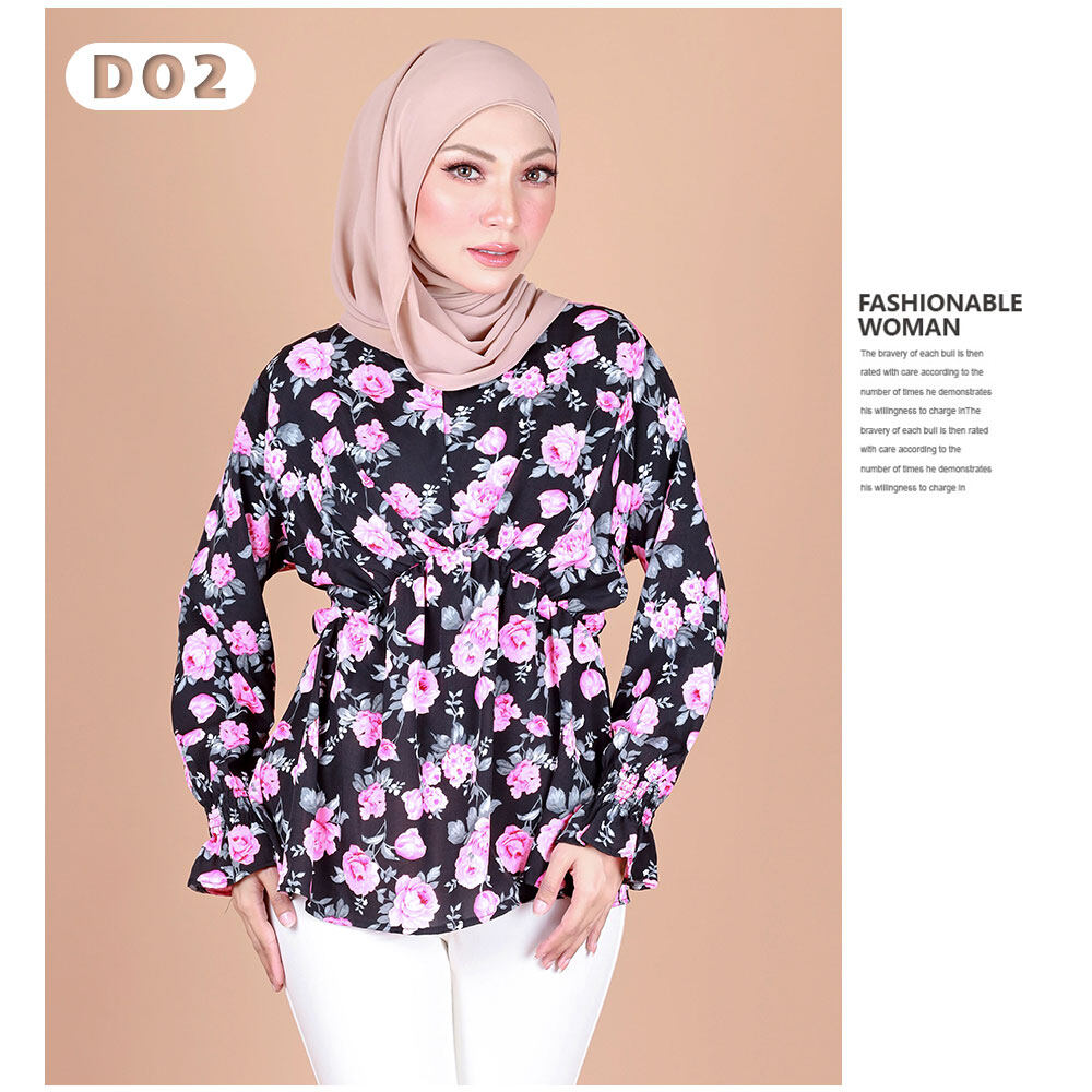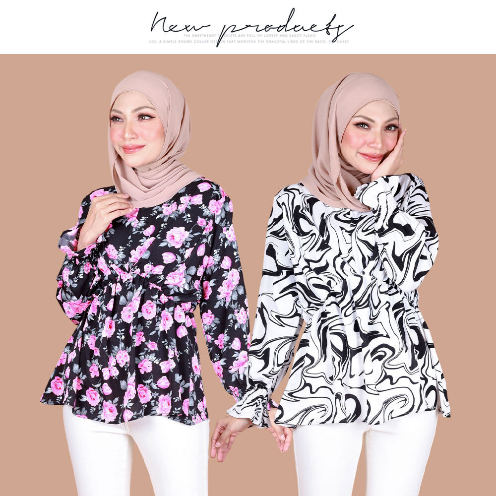 Women Fully Printed Elastic Ruffled Cuff Sleeves Blouse Fareha Top Muslimah Baju Wanita [B8548]