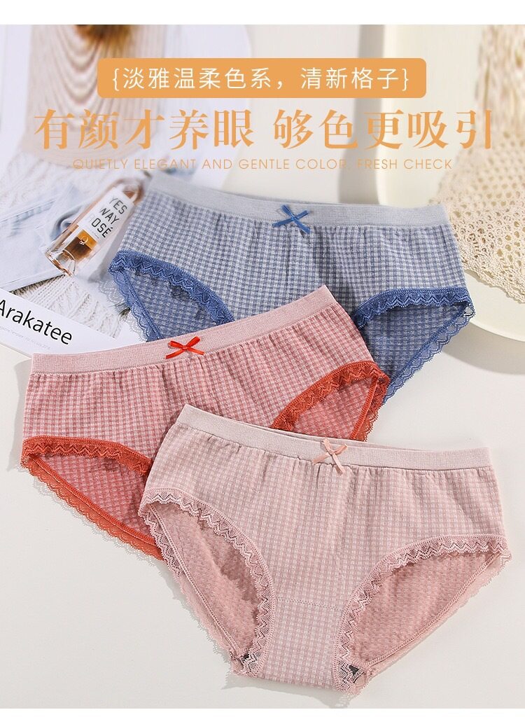 Women Graphene Antibacterial Checke Cotton Mid Rise Lace Panties [L25645]